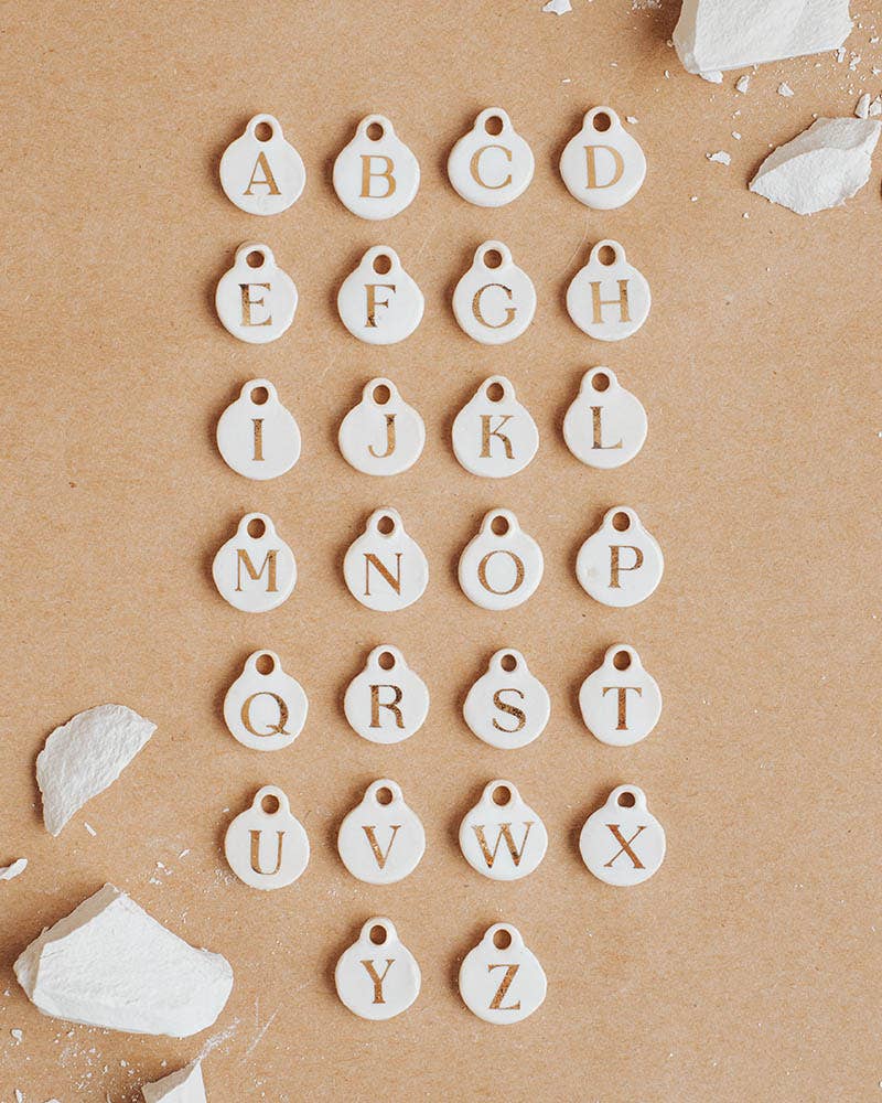 Ceramic initials are made from high-fired stoneware clay. Jump rings are brass base metal and plated in the US with 24k gold and .999 fine silver. 0% nickel content.