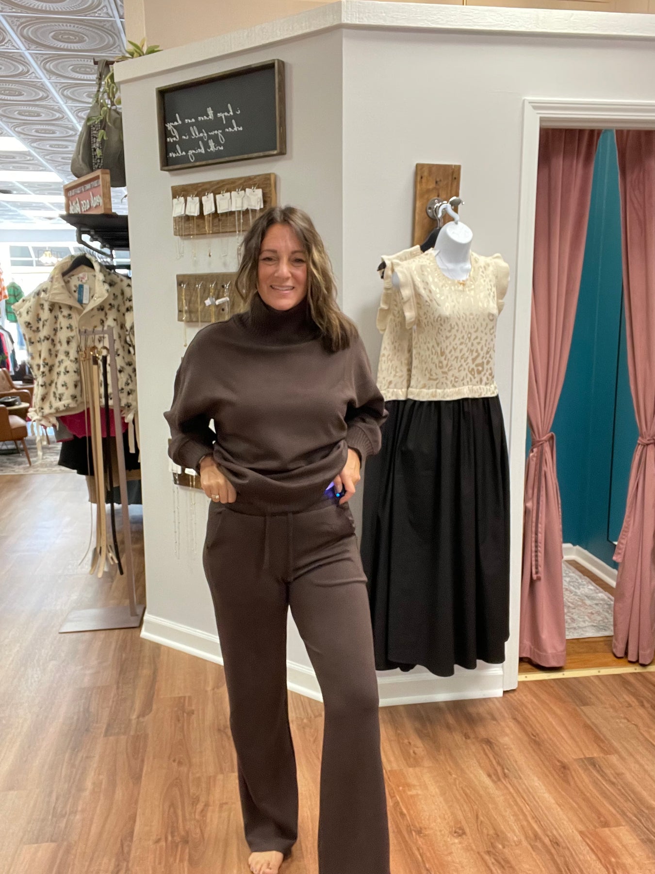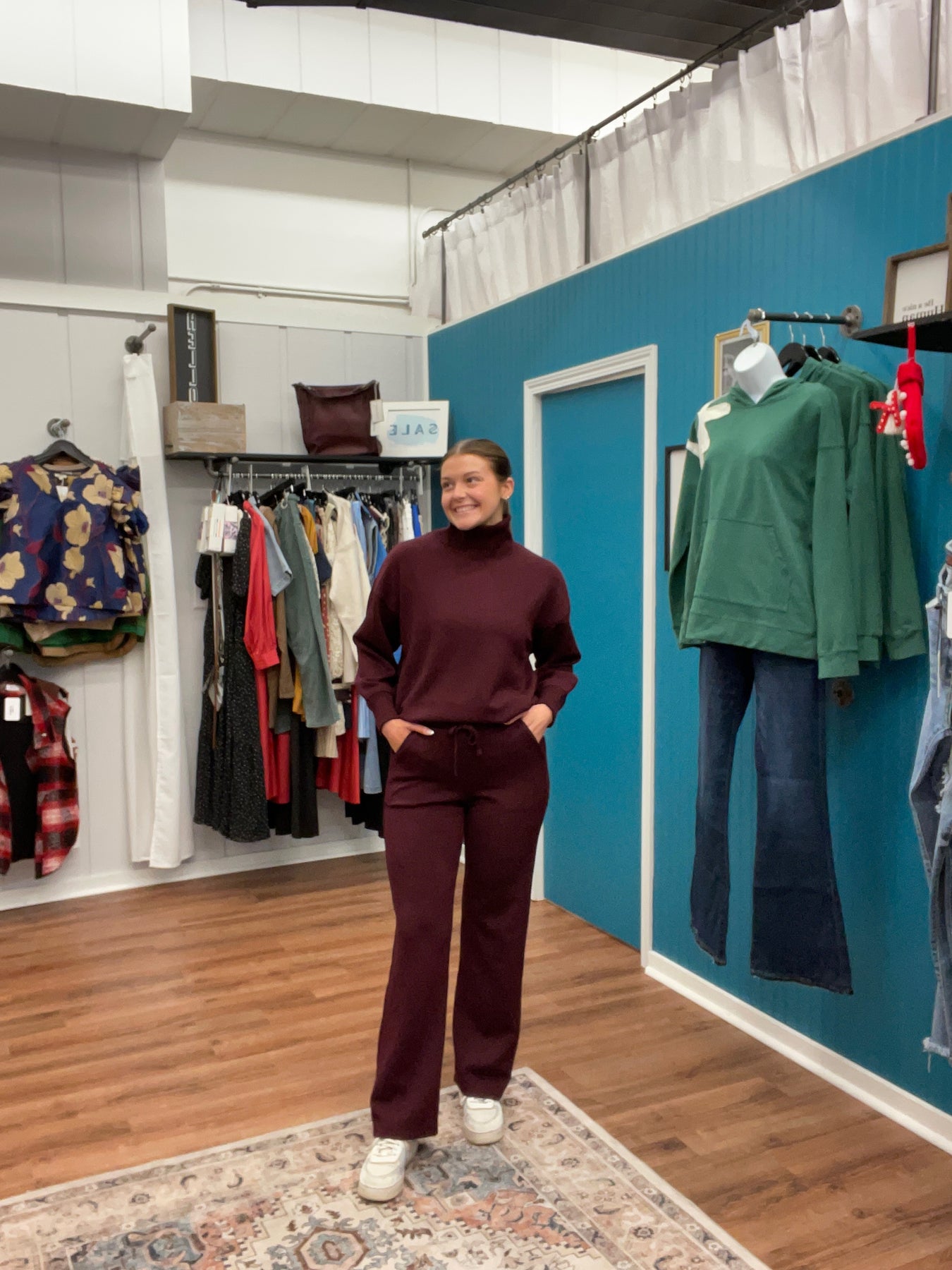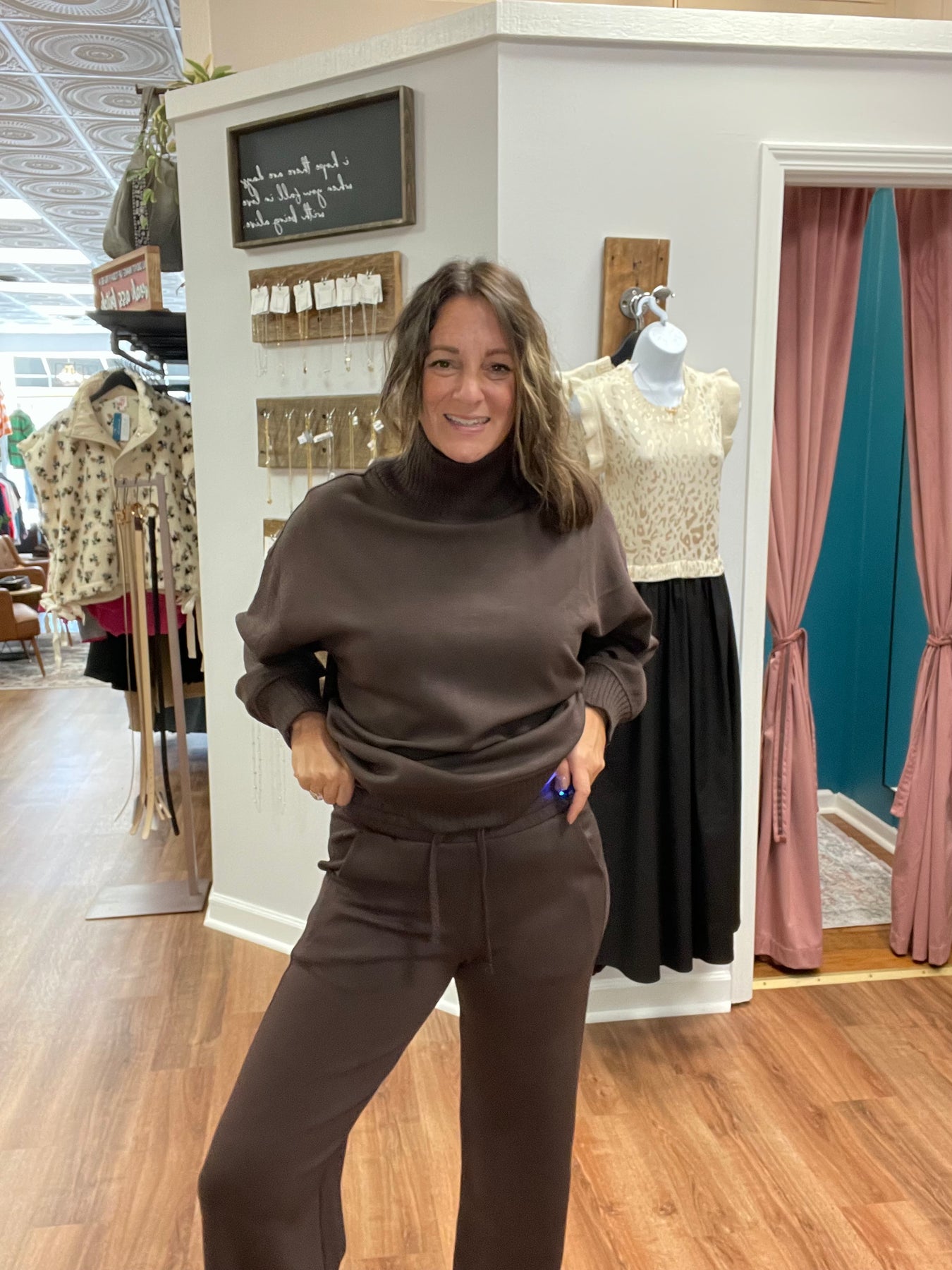 Elevate your wardrobe with this sleek pullover crafted from our signature modal scuba fabric, known for its silky smooth feel, lightweight comfort, and breathability. Designed with a modern mock neck and finished with 4x2 rib contrast detailing on the sleeve cuffs and hemline, it offers a refined yet relaxed look that effortlessly transitions from casual to polished. Perfect for adding subtle texture and clean lines to any outfit, this pullover is a versatile staple you’ll reach for again and again. Bottoms are a relaxed fit with a slightly wide leg for effortless style.