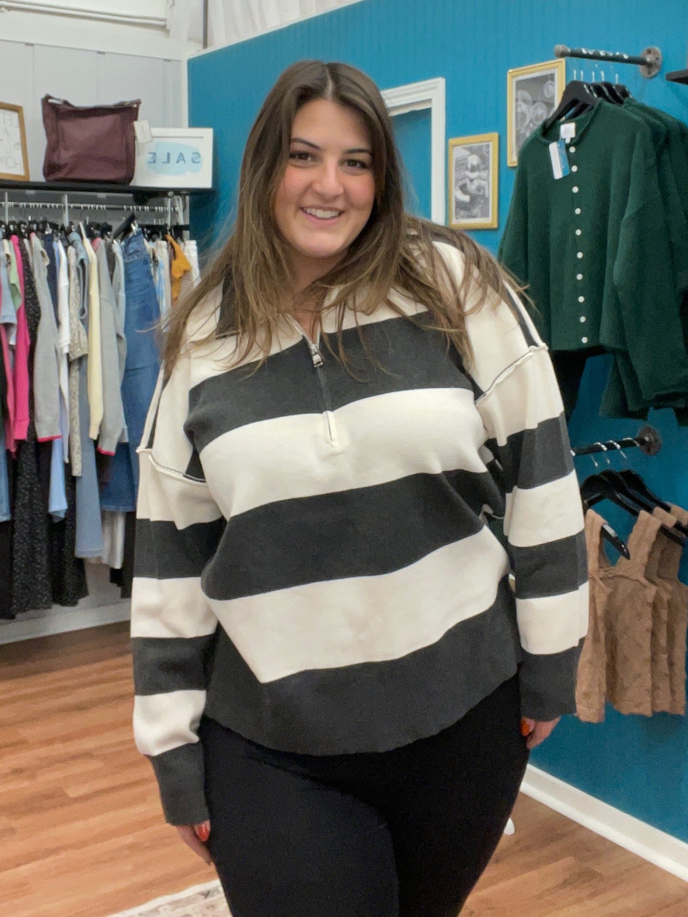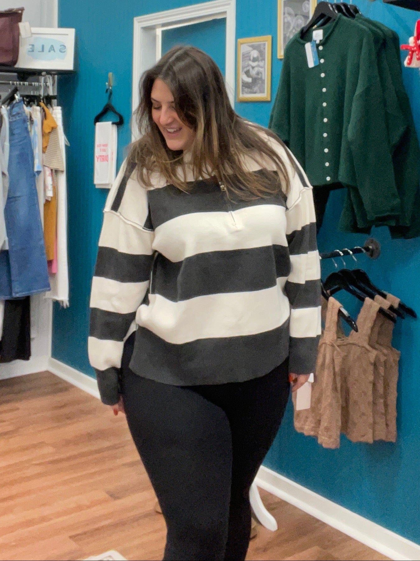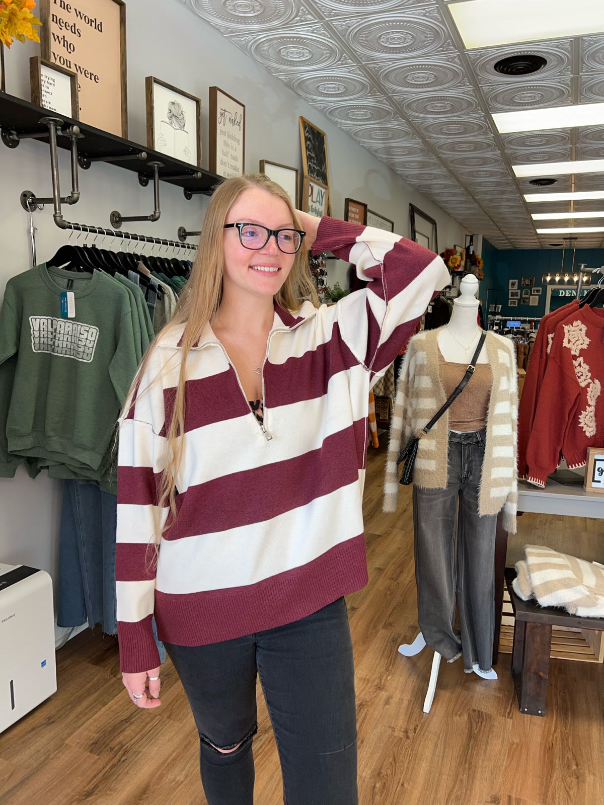 This cozy stripe sweater top features a fun drop shoulder design with a front zip-up for easy style play. The reversed stitch accents add a quirky twist, while side slits keep your look effortlessly cool and comfy. Perfect for layering or rocking on its own!