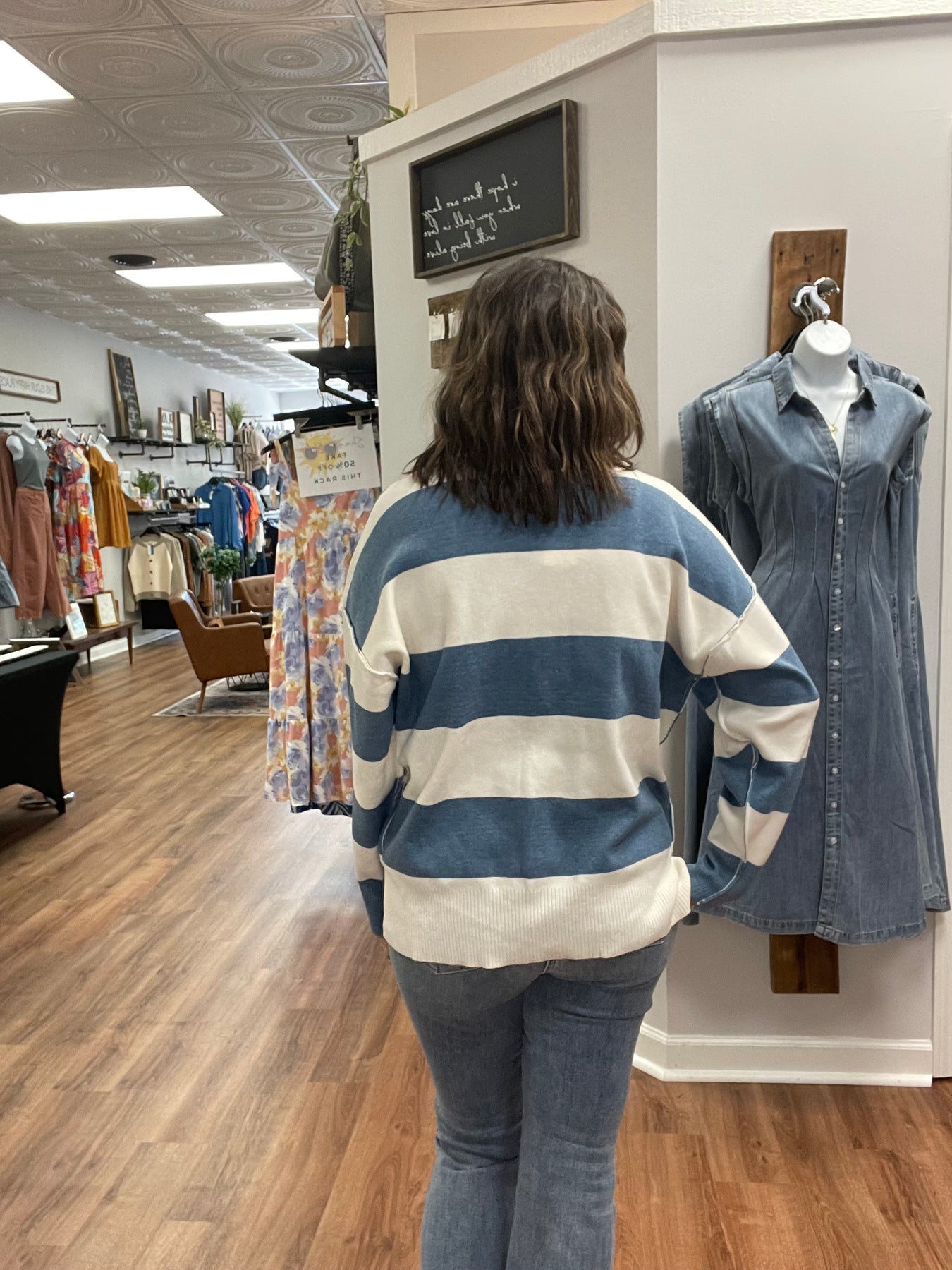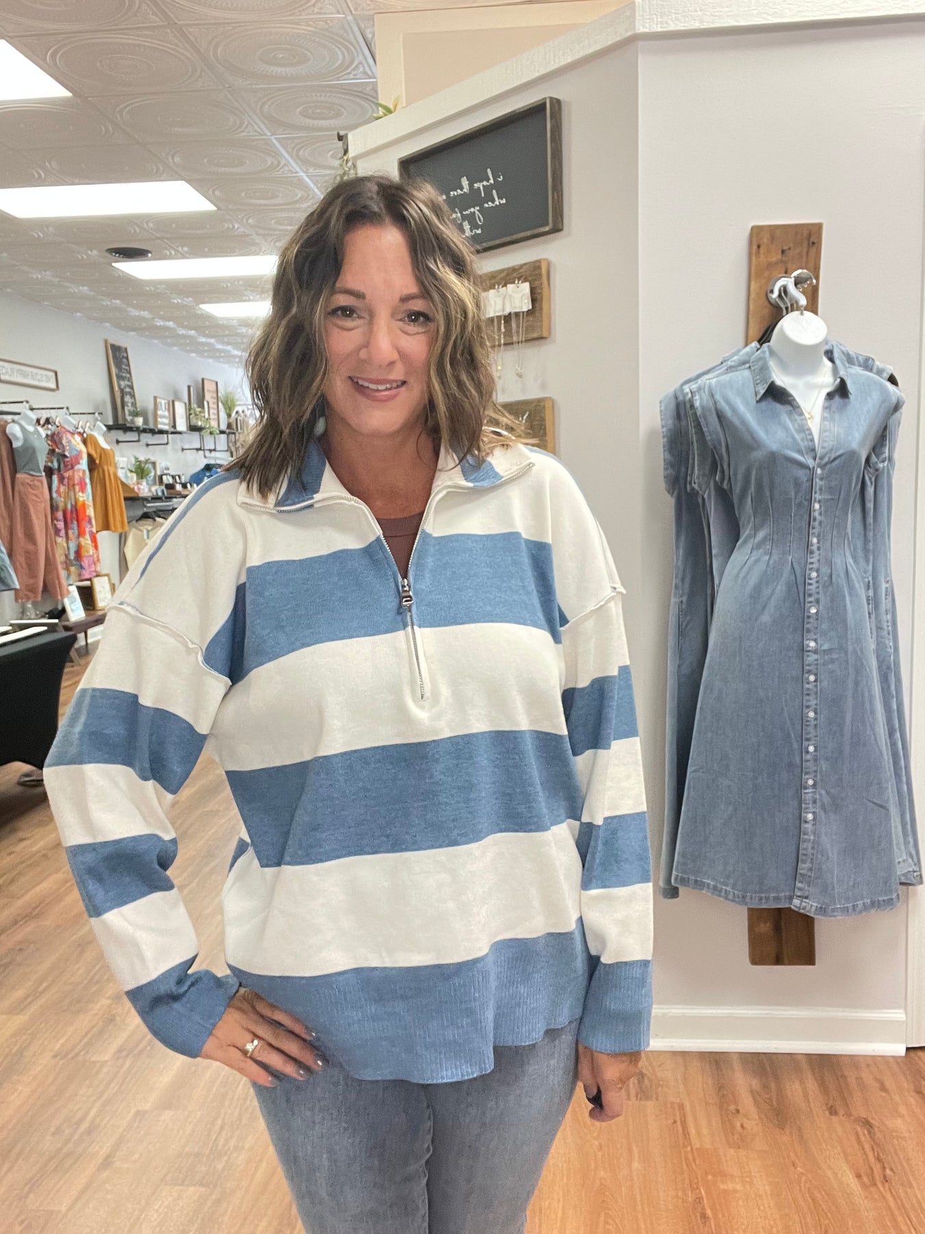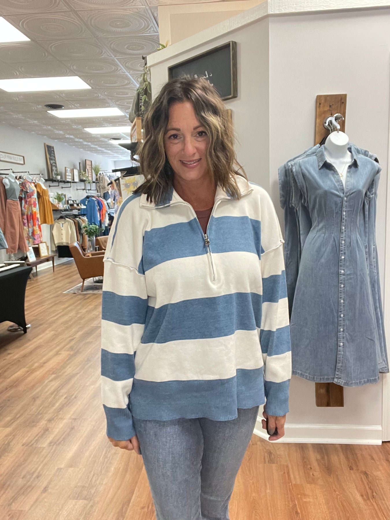 This cozy stripe sweater top features a fun drop shoulder design with a front zip-up for easy style play. The reversed stitch accents add a quirky twist, while side slits keep your look effortlessly cool and comfy. Perfect for layering or rocking on its own!