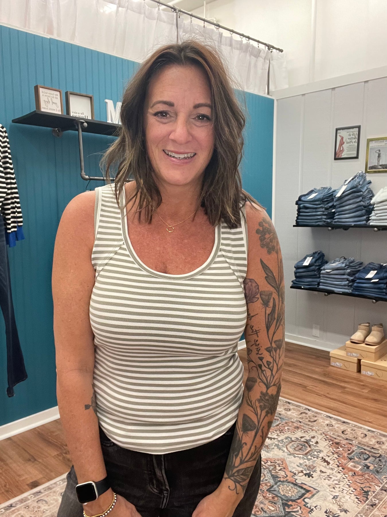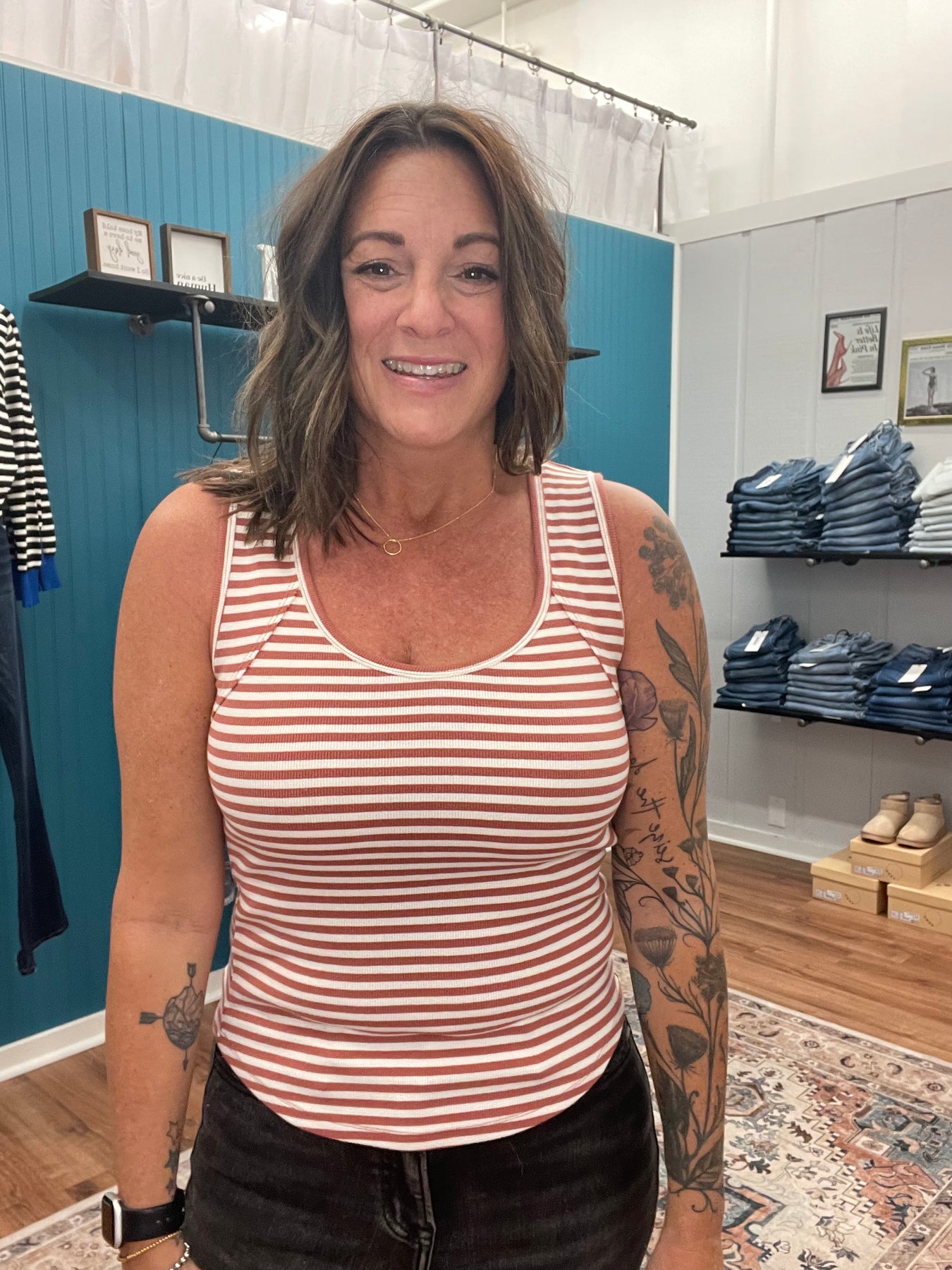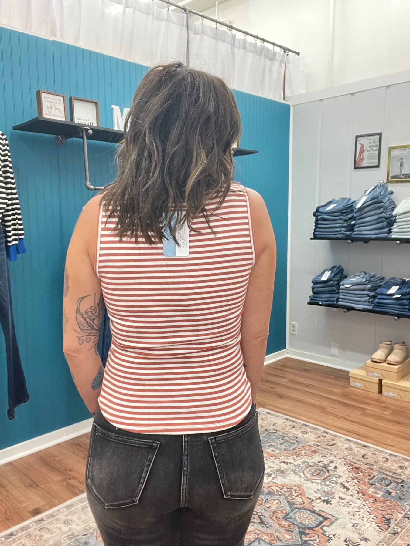 Slip into effortless style with this classic cotton ribbed tank. Crisp stripes keep things fresh and fun, while thoughtful seam detailing at the sleeves adds just the right amount of visual interest. Lightweight and breathable, it's your new go-to for layering or solo wear. Perfect for those days when you want to look put-together without trying too hard.