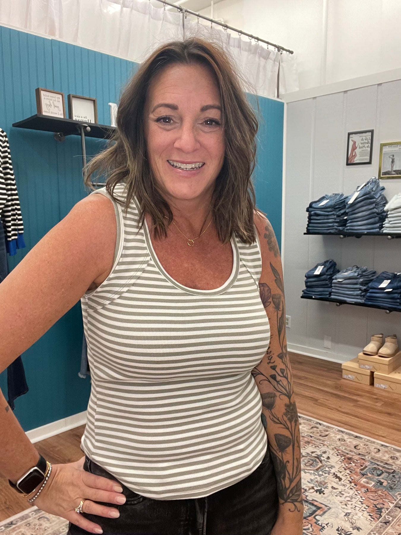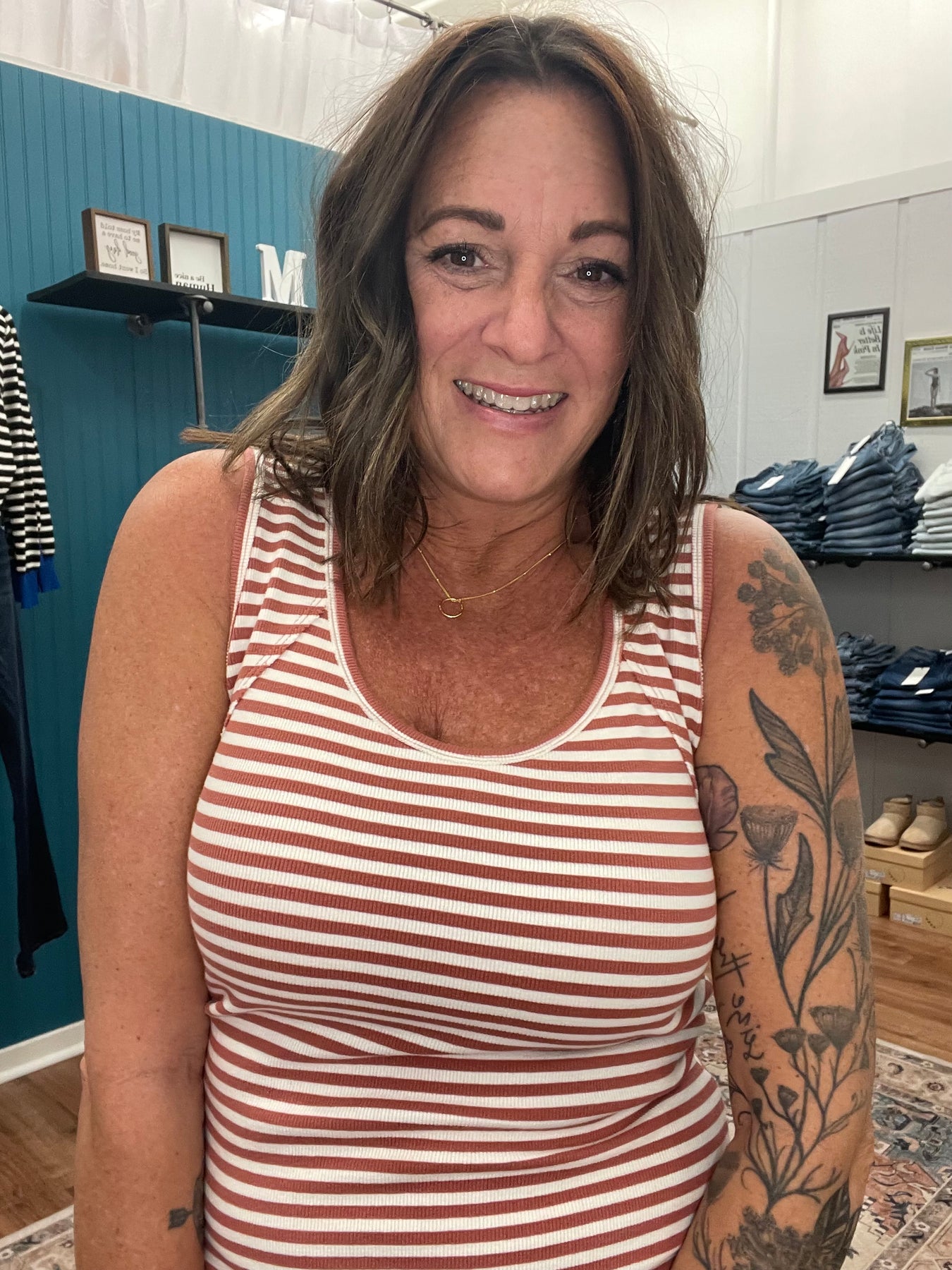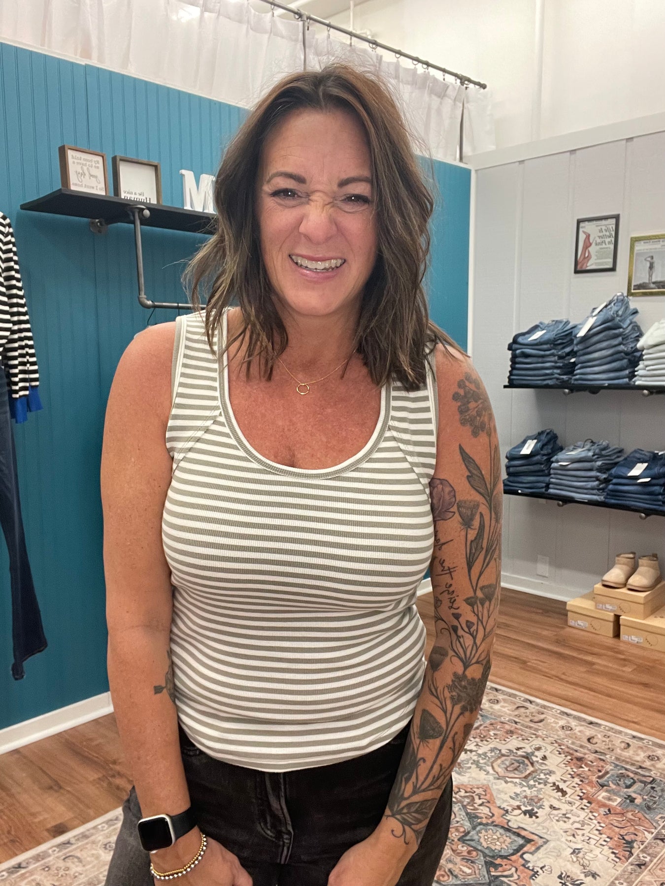 Slip into effortless style with this classic cotton ribbed tank. Crisp stripes keep things fresh and fun, while thoughtful seam detailing at the sleeves adds just the right amount of visual interest. Lightweight and breathable, it's your new go-to for layering or solo wear. Perfect for those days when you want to look put-together without trying too hard.