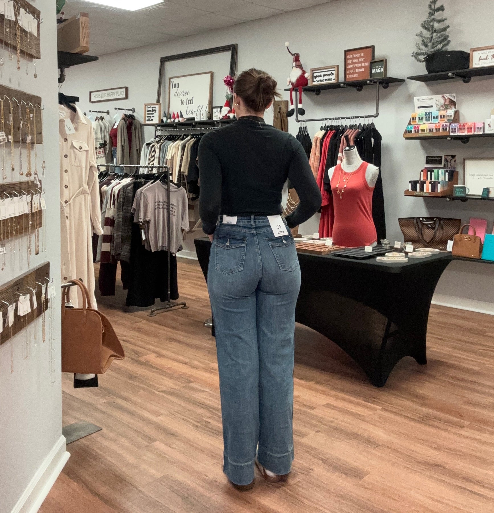 Take your style to the next level with our Los Angeles Super High Rise Tuxedo Denim. Featuring a super high rise waist and a sleek tuxedo stripe, this denim elevates any outfit with a touch of quirky sophistication. Embrace your unique style and show off your playful side with these must-have jeans.