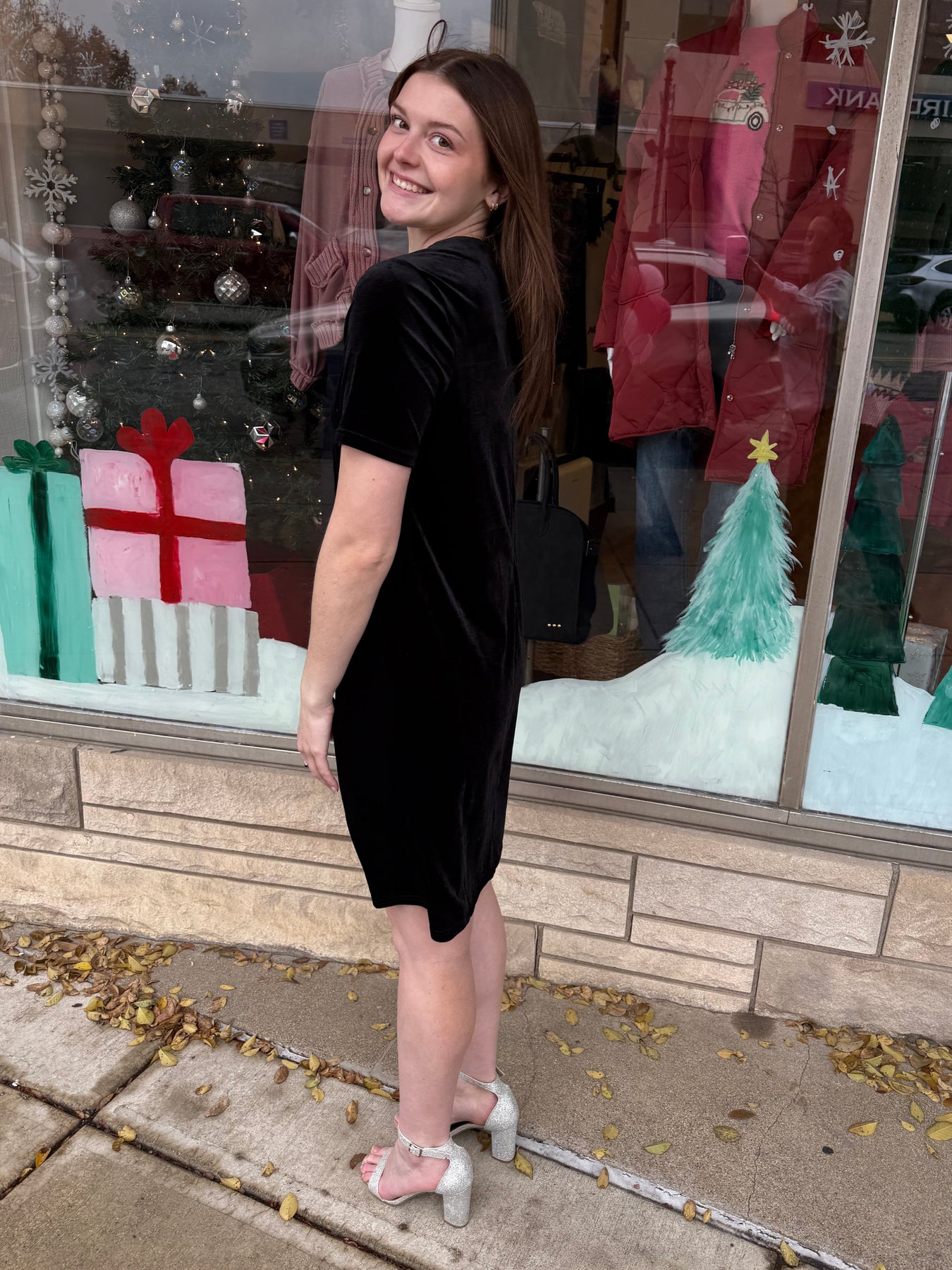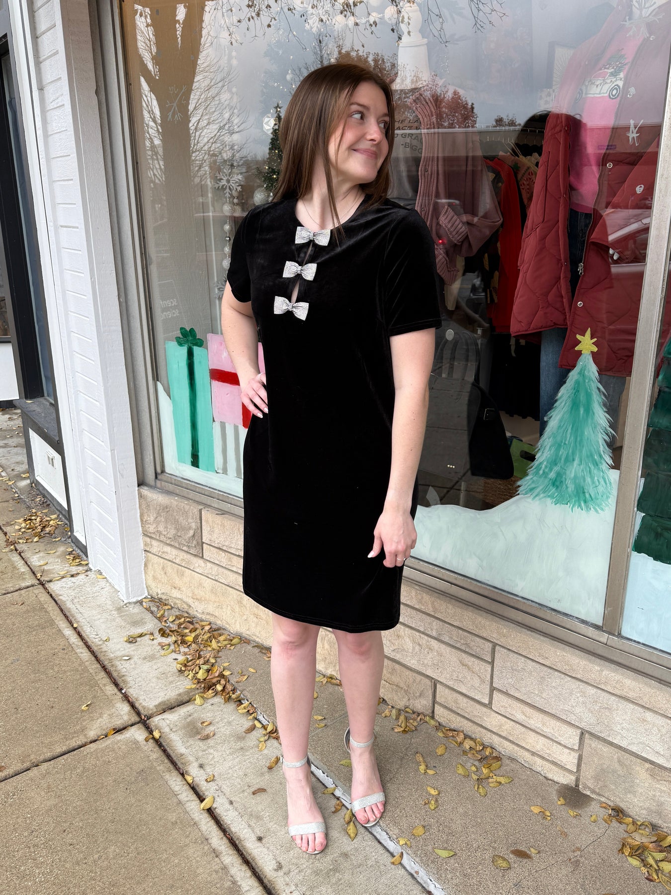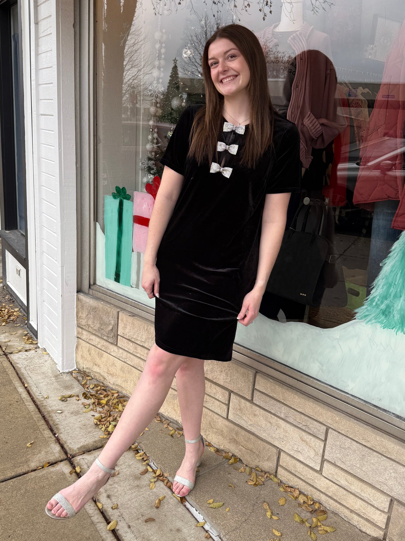 Elevate your evening wardrobe with this sophisticated mini velvet dress, designed for those who appreciate refined elegance. The luxurious velvet fabric drapes beautifully while the classic round neckline and short sleeves offer timeless appeal. Delicate sequin bow accents catch the light with every movement, adding just the right touch of glamour without overwhelming the piece. Perfect for cocktail events, holiday gatherings, or any occasion calling for polished sophistication. This dress strikes the ideal balance between understated luxury and eye-catching detail.