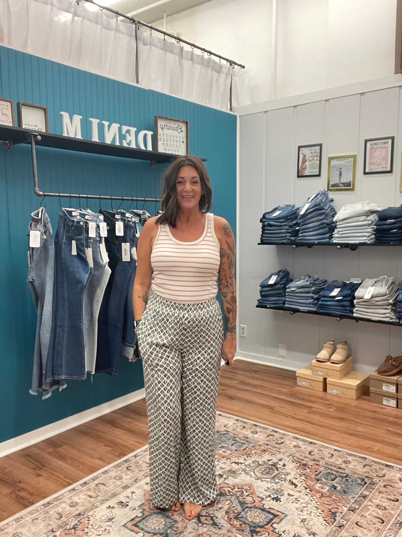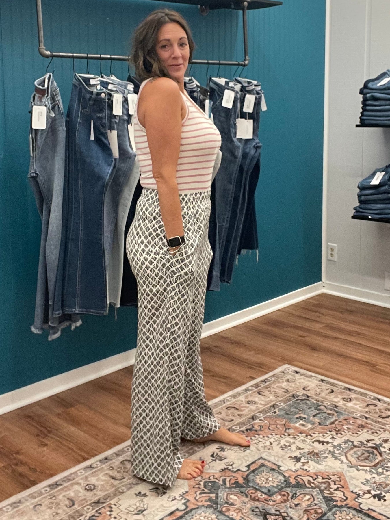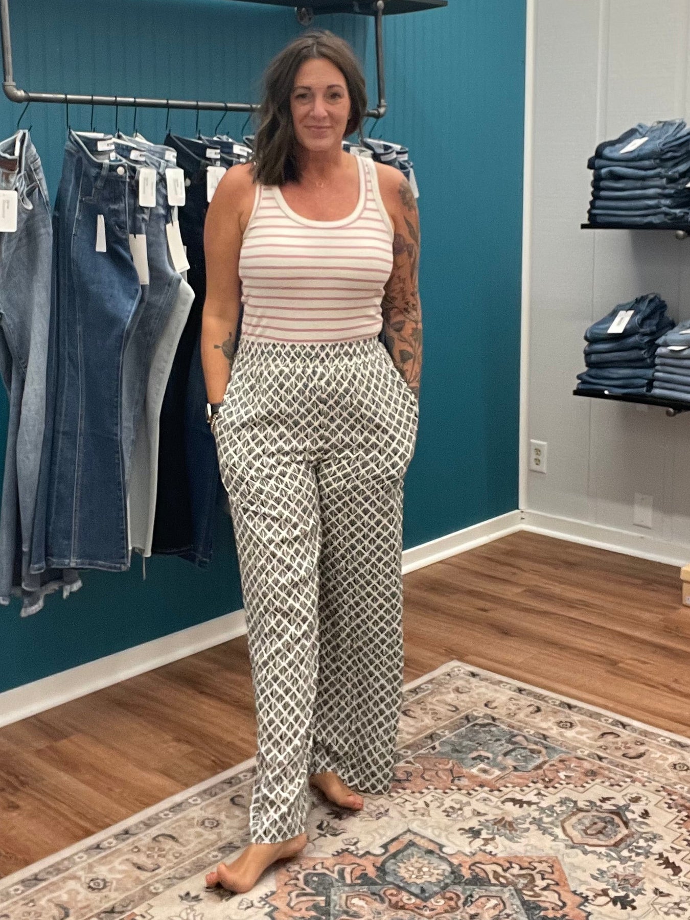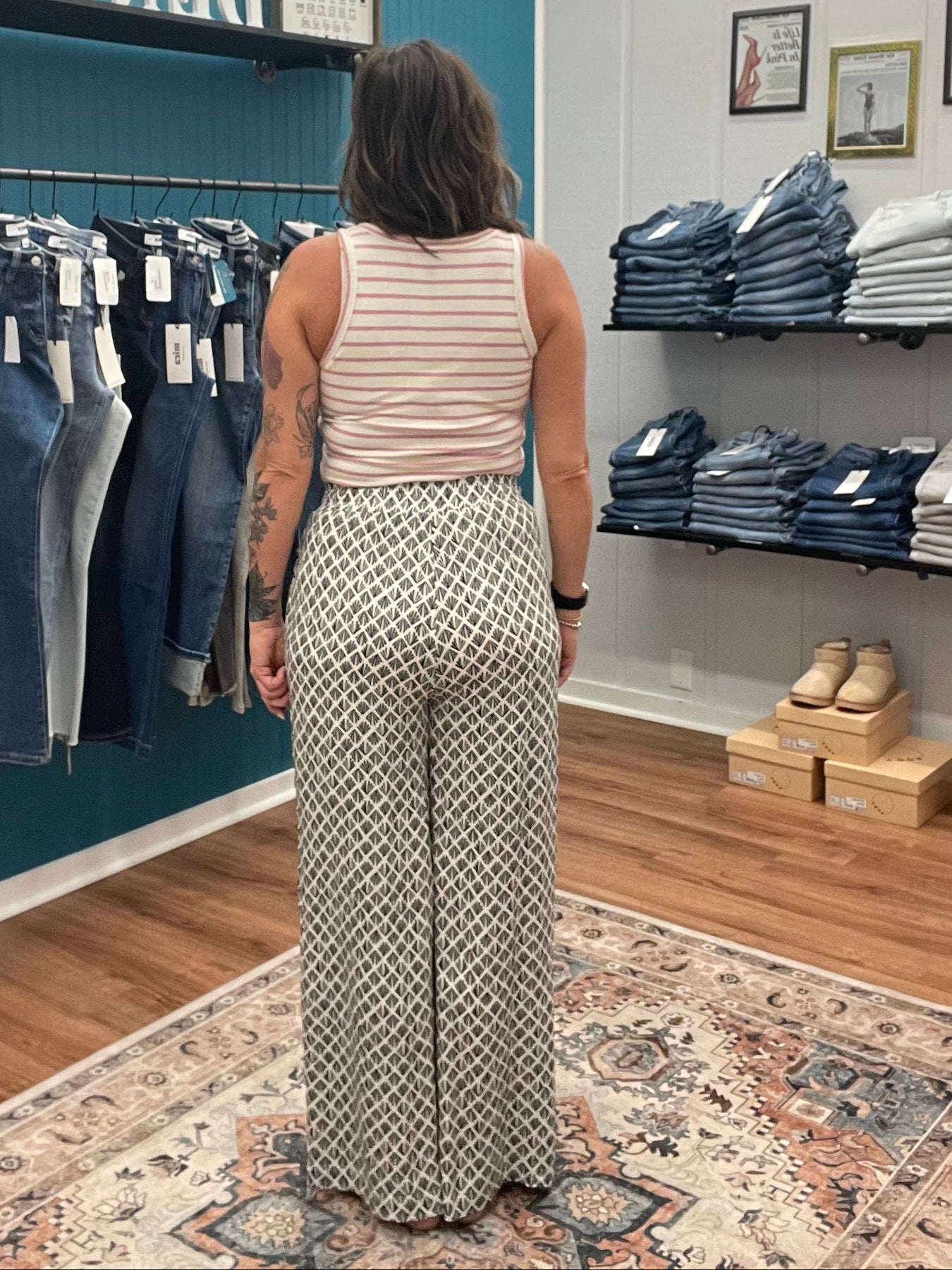Effortlessly chic and undeniably comfy, these flowy wide-leg printed pants are your new go-to for laid-back style. The elastic waist hugs you just right while the generous leg drapes beautifully for that coveted relaxed vibe. Whether you're running errands or meeting friends for brunch, these pants deliver movement and personality in one fabulous package. The eye-catching print adds instant flair to any outfit, making them the perfect piece to mix and match with your favorite basics. Pants are lined to the thigh.