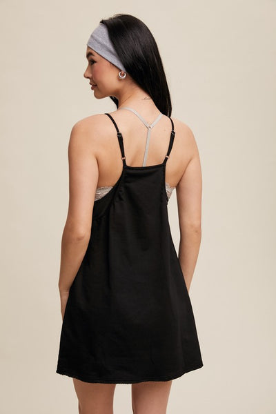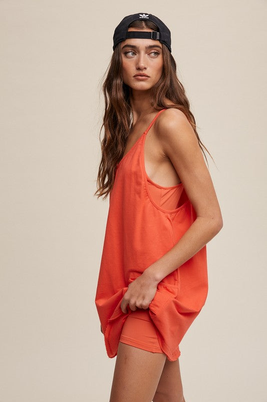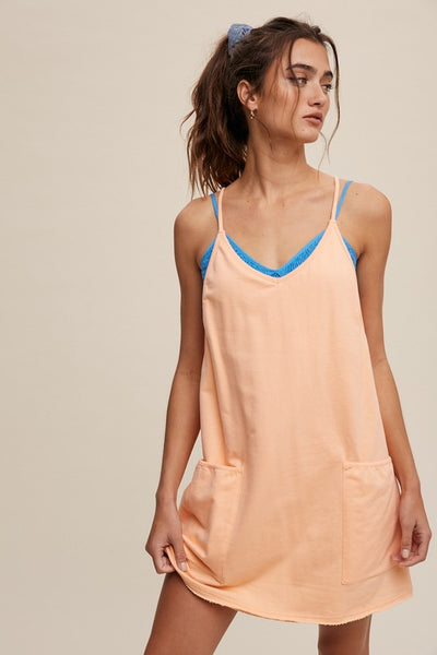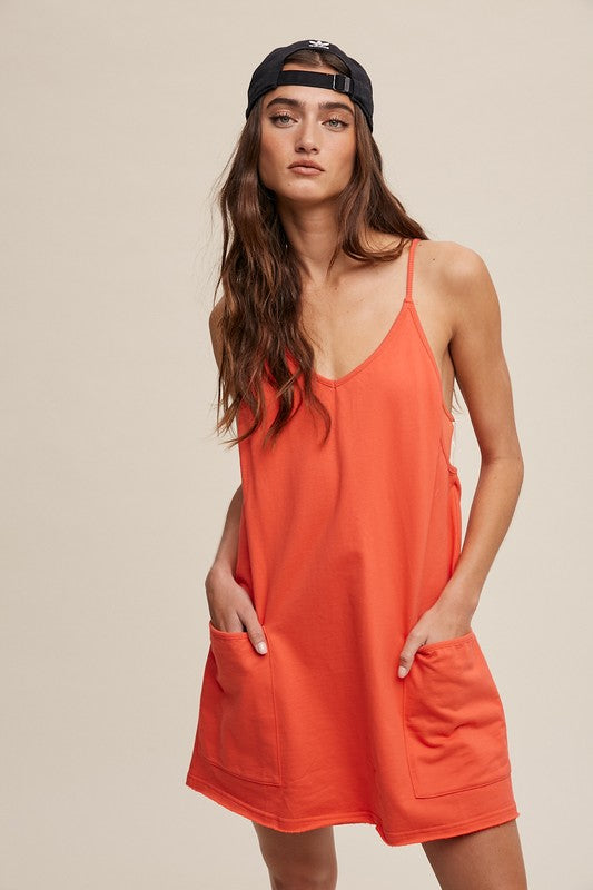 Sporty mini dress with built in romper liner! Featuring a v neckline, adjustable shoulder straps, big front patch pockets, finished clean hem and the romper is adorable and perfection!