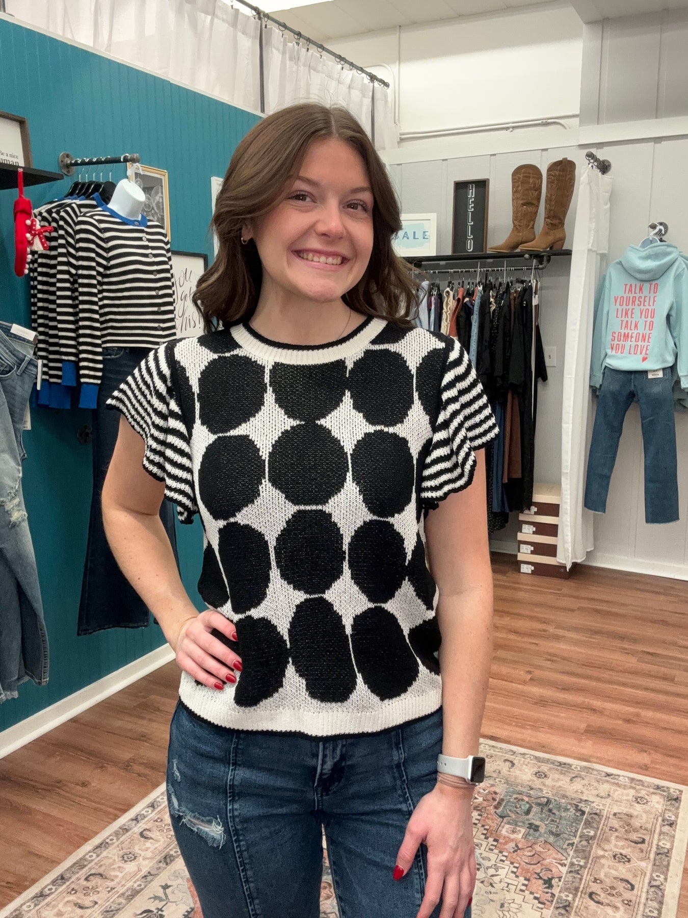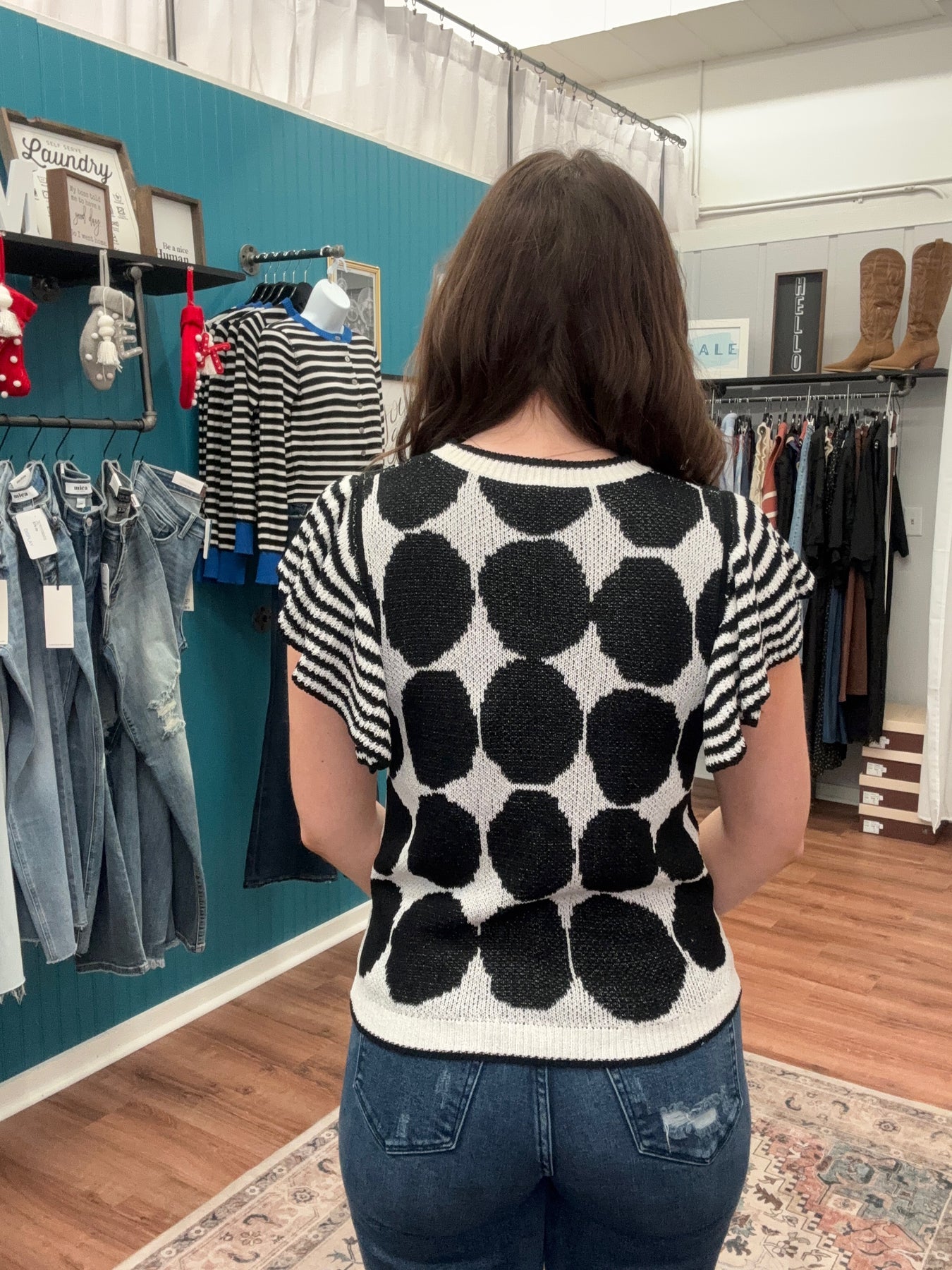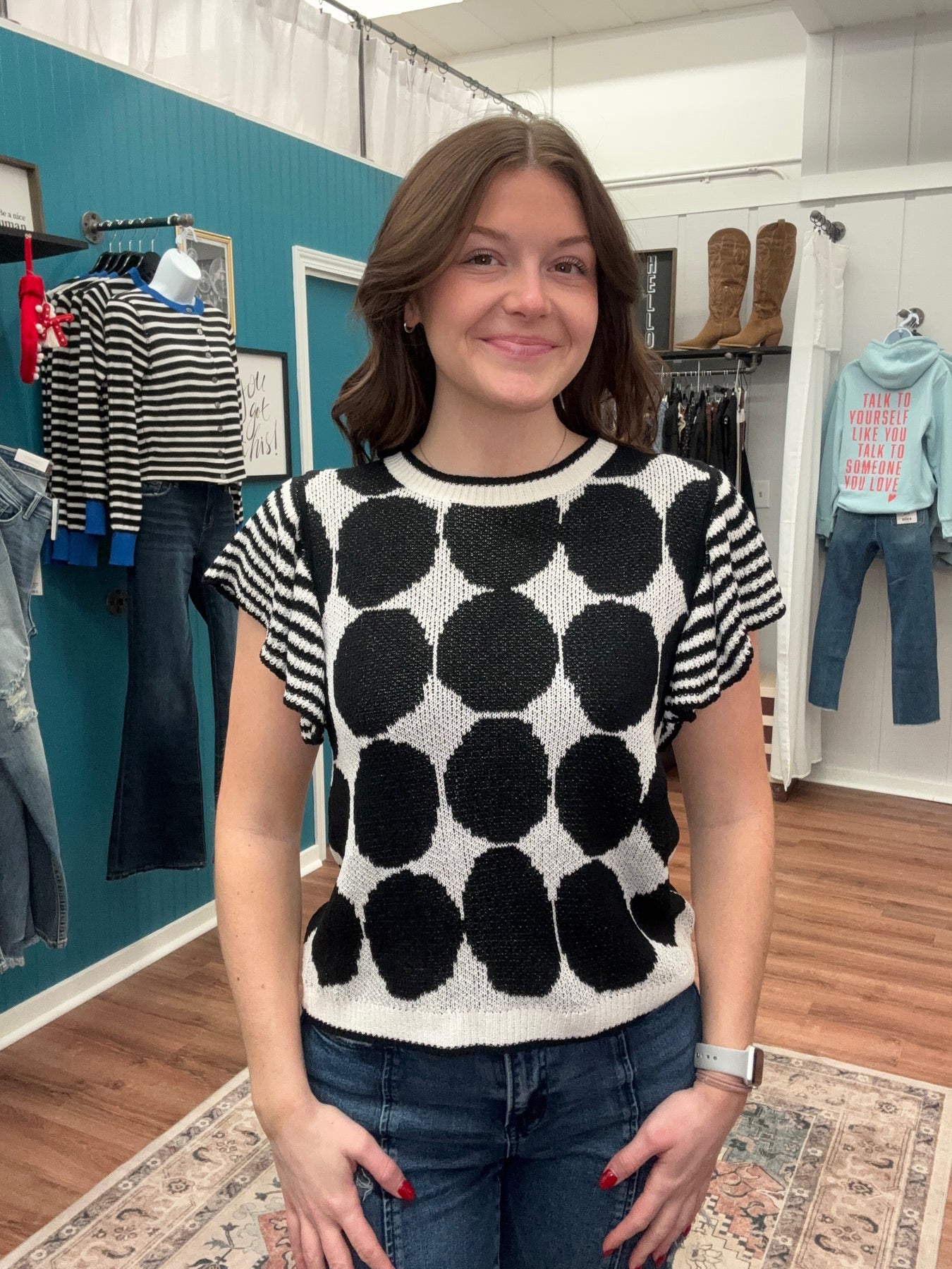 This mixed-pattern knit top combines playful polka dots with classic stripes for dynamic visual interest. The graceful U-neckline creates an elegant frame, while flutter sleeves deliver a modern, feminine touch. Constructed from quality knit material that offers comfort and durability, this piece adapts effortlessly to your lifestyle—whether styled casually with denim or dressed up for social occasions. A thoughtfully designed essential that brings personality and polish to any wardrobe.