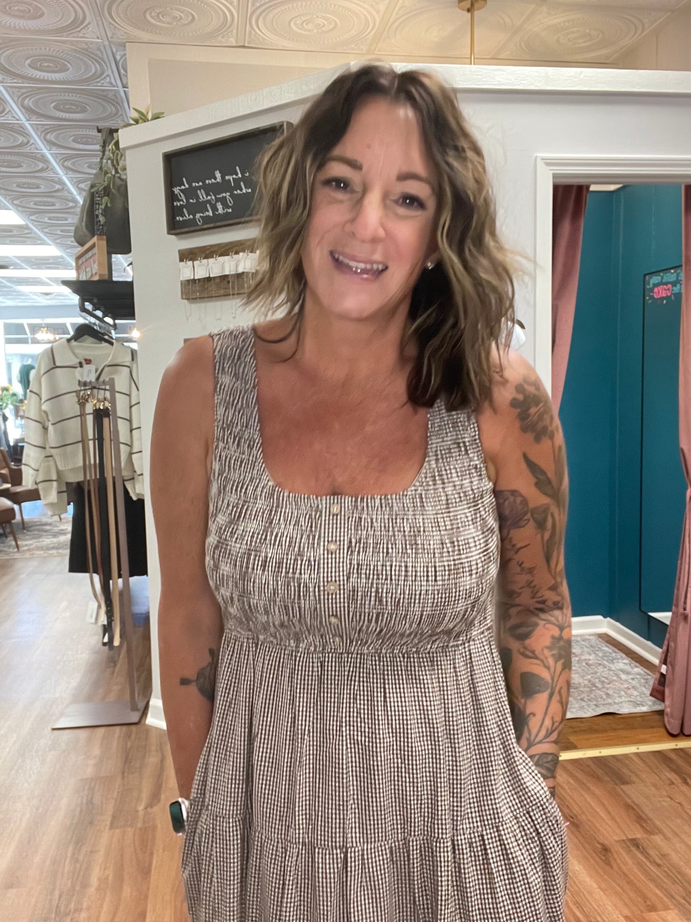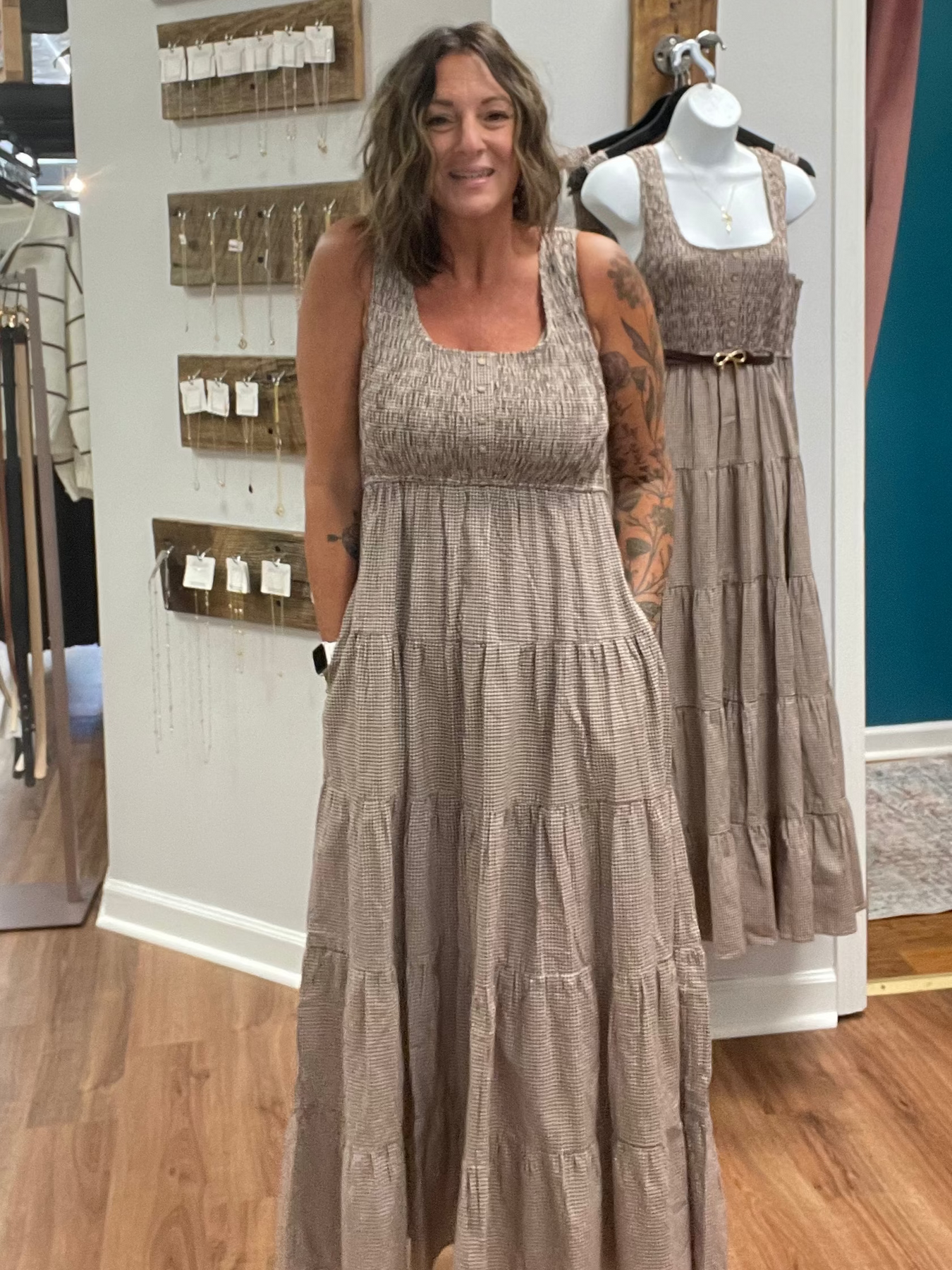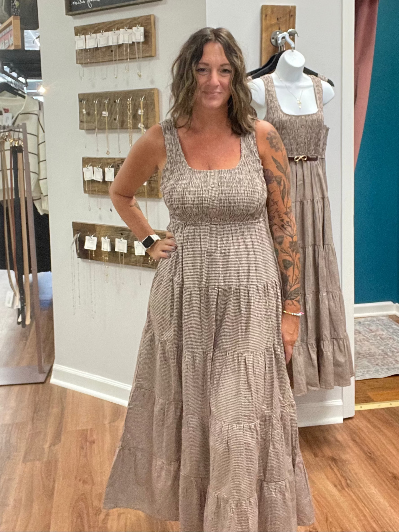 Make a bold statement in this plaid tiered midi dress, designed to turn heads with its edgy mix of classic pattern and modern silhouette. The tiered layers add movement and volume, creating a dynamic look that commands attention. Perfect for those who aren’t afraid to stand out, this dress balances sophistication with daring flair. Side pockets as well.