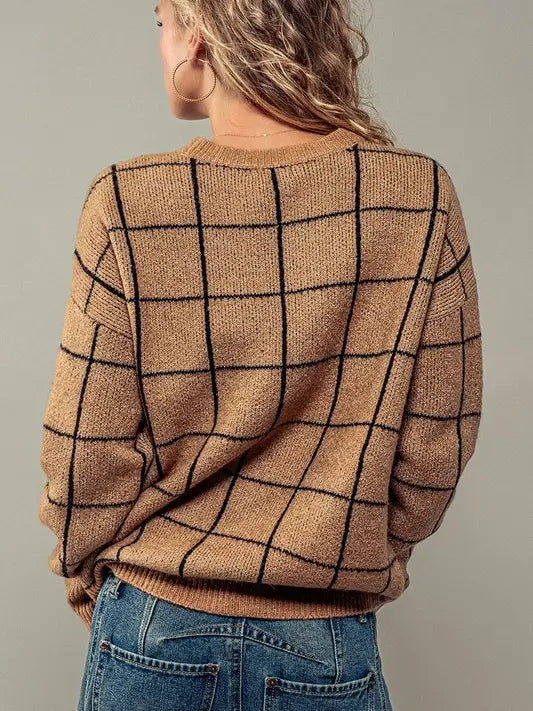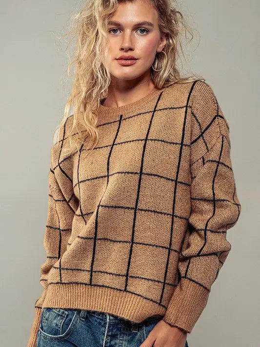 Speckled knit grid sweater with ribbed trim and crew neckline. We love the grid print and it is so cute and cozy!
