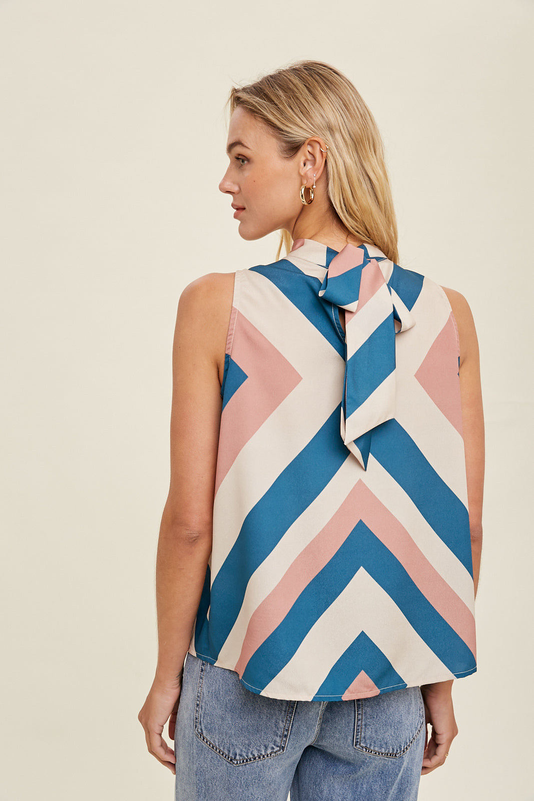 Elevate your wardrobe with this multi-color chevron blouse, featuring a refined self-tie back detail that adds a subtle yet elegant touch. The vibrant chevron pattern brings a dynamic visual appeal, while the tailored fit ensures a polished silhouette. Perfect for both professional settings and stylish outings, this blouse combines comfort with sophistication effortlessly.
