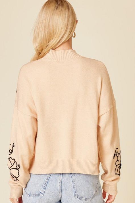 Floral embroidered sweater top featuring mock neck, dropped shoulder and cuffed sleeves.
