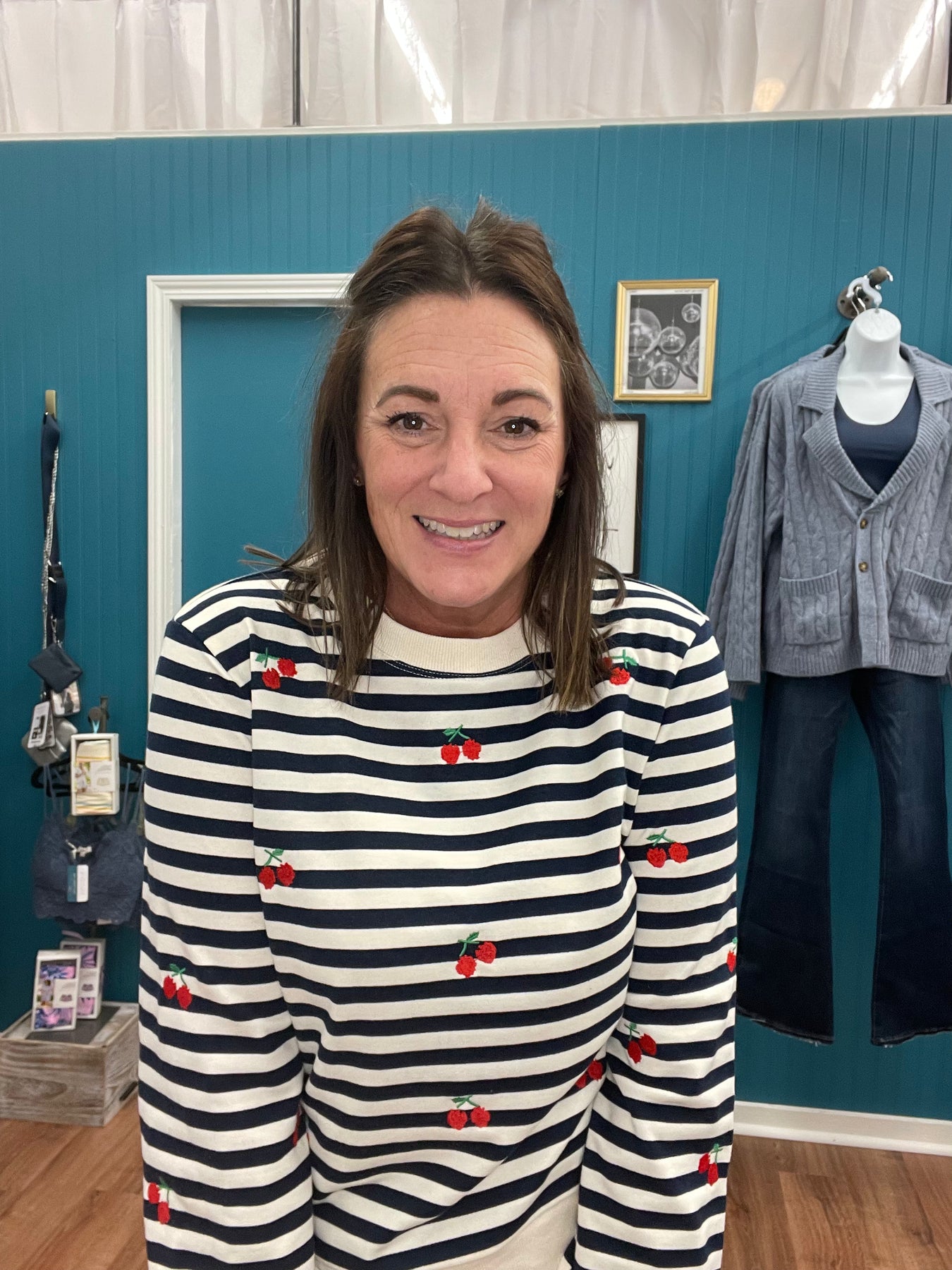 This versatile long-sleeve striped top combines effortless style with thoughtful design details. The classic stripe pattern provides a timeless foundation, while hand-placed cherry embroidery adds a distinctive focal point that elevates the piece beyond basic basics. The relaxed silhouette works beautifully for casual outings, weekend errands, or layered styling options. Quality construction ensures durability through repeated wear and washing, making it a reliable staple that pairs seamlessly with your existing wardrobe. An understated yet memorable choice for those who appreciate refined casual wear.