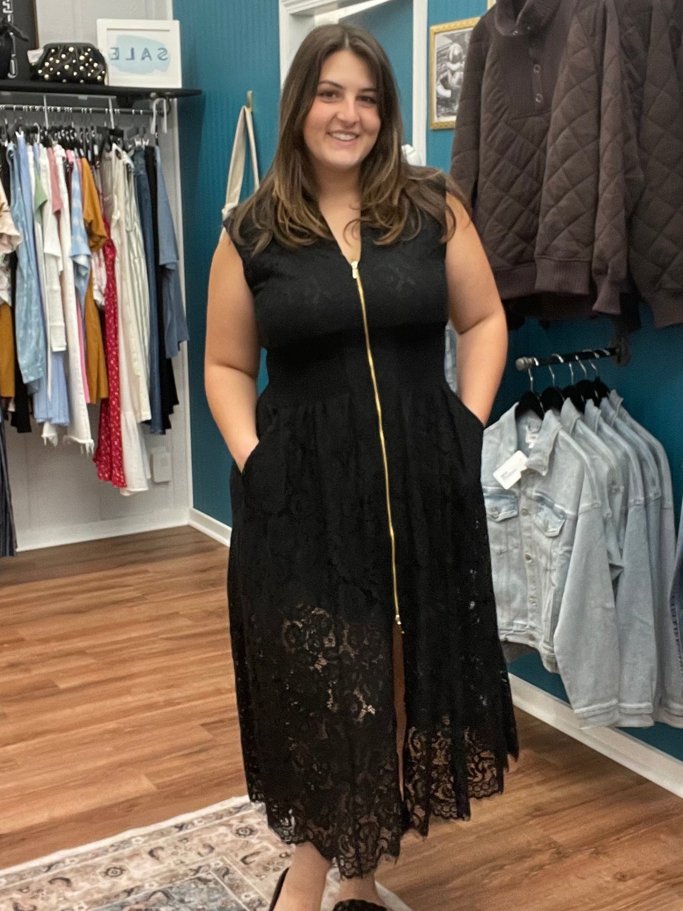 Elevate your elegance with this sleeveless lace dress featuring a sleek gold front zip closure. Its delicate lace fabric offers a refined texture, while the streamlined silhouette enhances your figure gracefully. Perfect for formal occasions or evening events, this dress combines classic design with modern sophistication for a timeless addition to your wardrobe.  Dress has amazing pockets too!