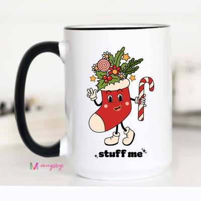 Double sided print. Top rack dishwasher safe. Microwave safe. Off white with a black rim and handle. Made of ceramic.