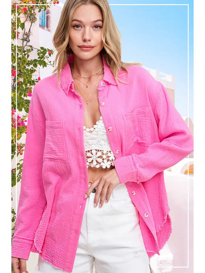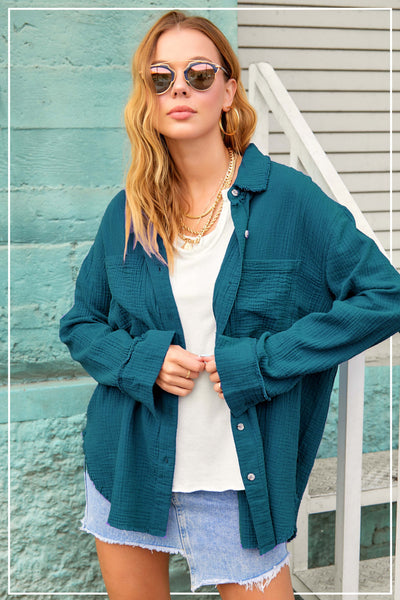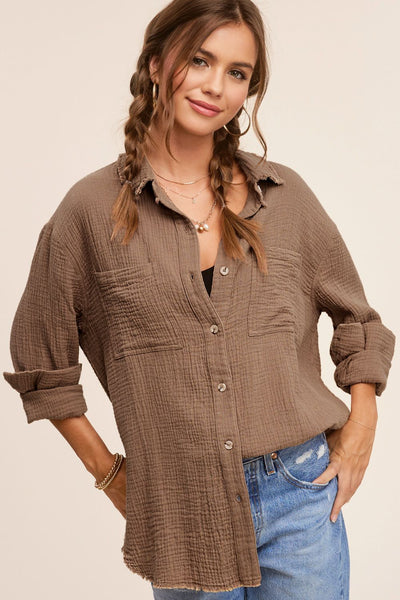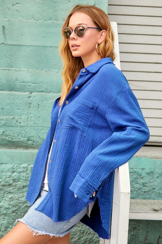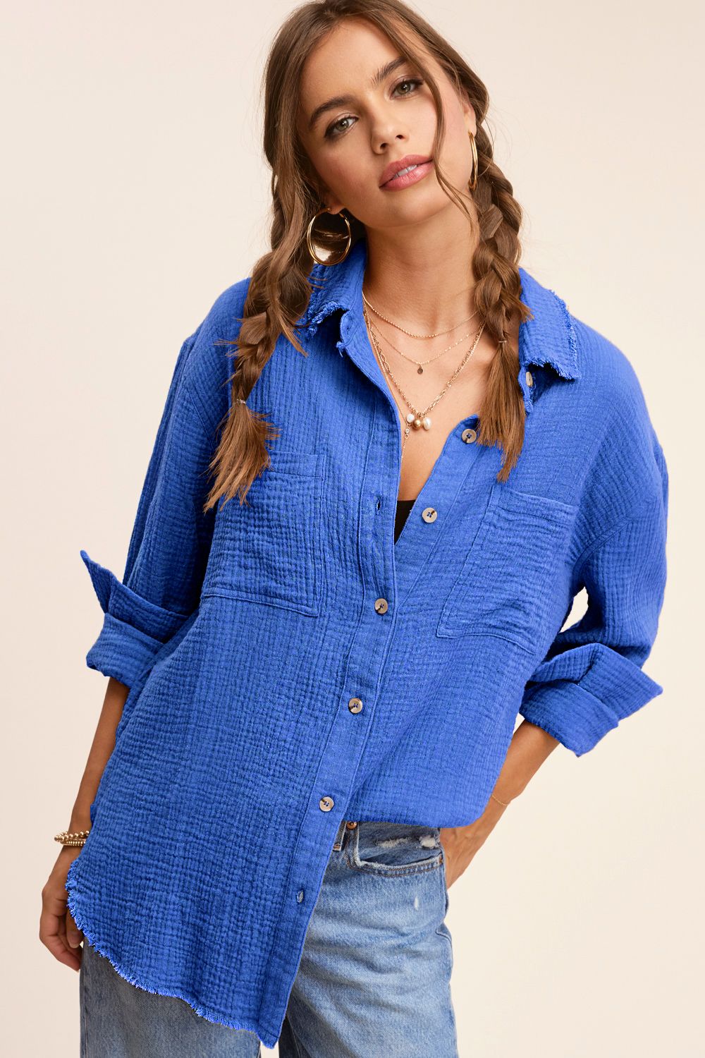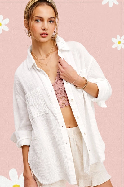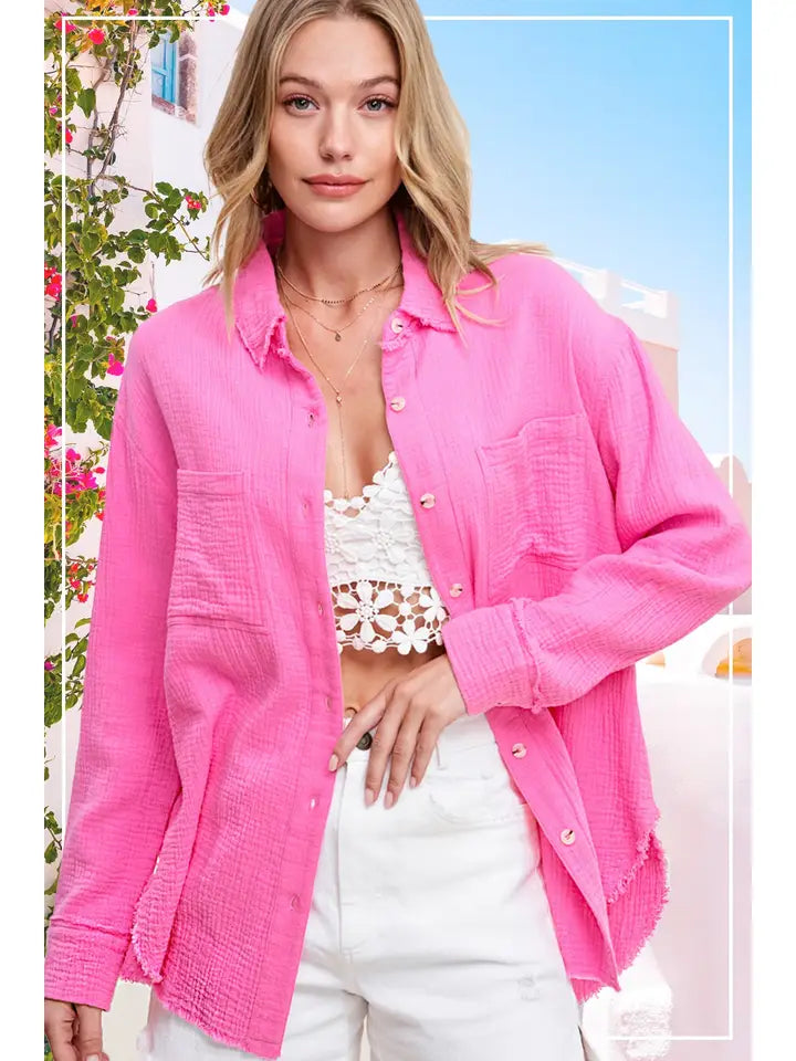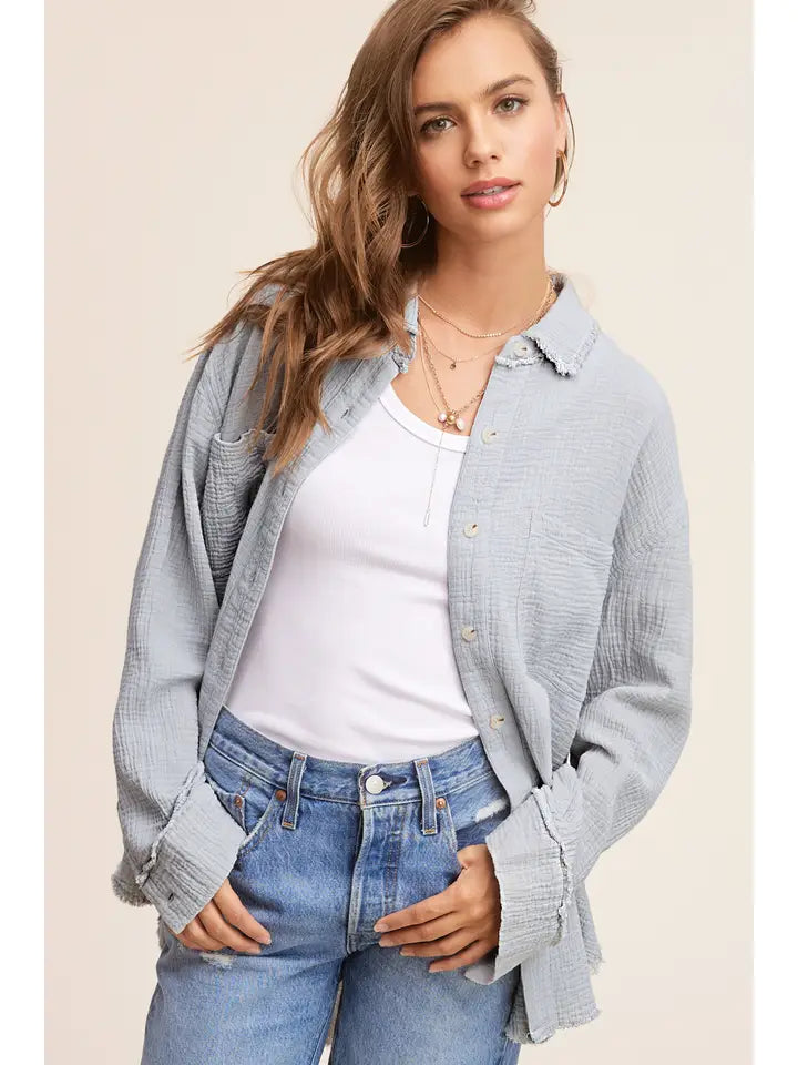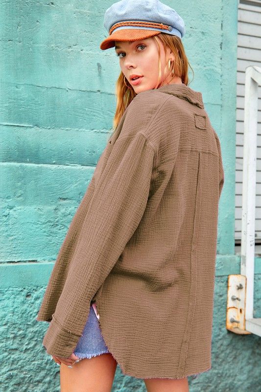 Soft washed button down shirt with oversized, slouchy silhouette in a gorgeous crinkled gauze with dual front pockets. The raw hemline makes it the most effortless style no matter the season. It will be your year-round favorite!