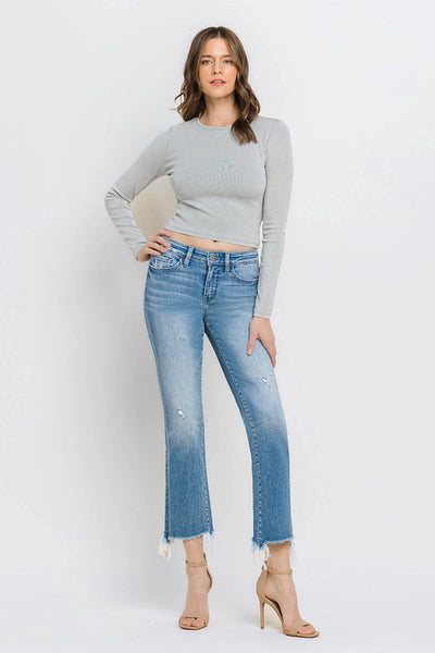 Mid Rise Frayed hem ankle bootcut denim. Featuring comfort stretch denim, slight distressed detail, frayed hem, ankle length and bootcut. These are comfortable and stylish - sure to elevate your look instantly.