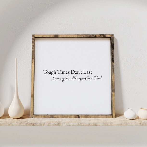 Our frames are made with real pine wood. We expect to see cracks, knots, holes and other imperfections. We believe this brings charm and character to our signs and makes each one truly unique. Our backing is made of recycled material. On the back of every sign we expect to see marks & imperfections that show this sign has already lived a full and happy life! They are not meant to be perfect! This sign is apart of our Kissel Kollection and was designed by Brett and Cecilia Kissel. This quote is from Brett's song 'Tough People Do'. Dimensions are: 13" wide by 13" long. Background color is white and is silk screened onto painted MDF Framed with stained pine wood Keyhole hanger is set into the back for flush and easy hanging All of our signs are made with 1/2” MDF backing with a 2” stained pine wood frame. We use acrylic paint on all of our products. We create all of our items with a process called silk screening.